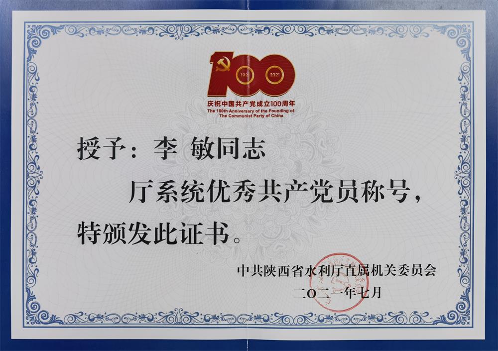 在庆祝建党100周年之际,为表彰先进、树立典型,激励各级党组织和广大共产党员、党务工作者在全面建设社会主义现代化国家新征程中奋勇争先、建功立业,7月8日,中共陕西省委直属机关工委在省委会议室召开省直机关学习贯彻习近平总书记“七一”重要讲话精神暨“两优一先”表彰大会,陕西省三和建设工程有限公司党支部书记、执行董事王小平被授予“陕西省直机关优秀共产党员”荣誉称号。7月9日,在水利厅学习贯彻习近平总书记“七一”重要讲话精神暨“两优一先”表彰大会上,三和公司党支部被授予“厅系统先进基层党组织”荣誉称号,公司总会计师李敏被授予“厅系统优秀共产党员”荣誉称号。