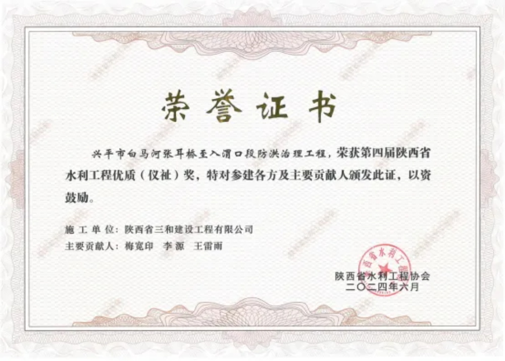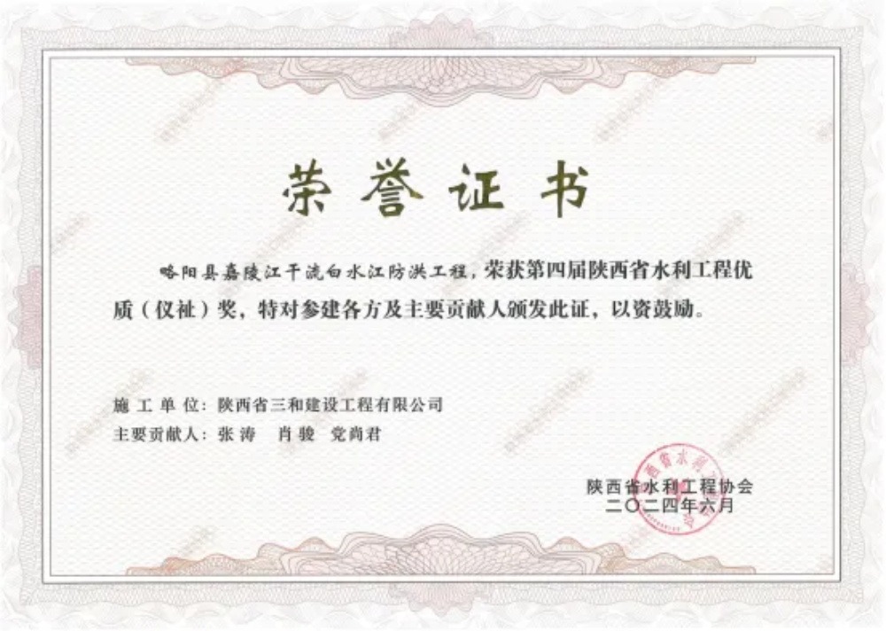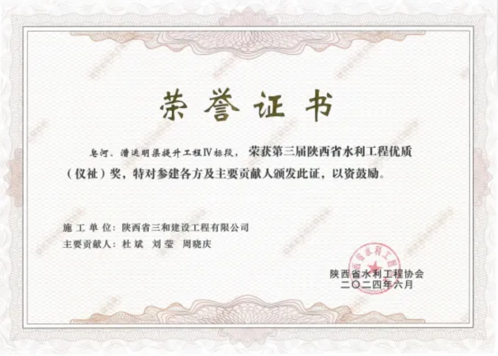 “陕西省水利工程优质(仪祉)奖”是陕西省水利行业优质工程的最高奖项,是以工程质量为主,兼顾工程建设管理、技术创新、工程效益和社会影响等因素设置的优秀水利建设工程奖项。三和公司获此殊荣,是企业施工质量、管理水平达到省内领先水平的具体体现。