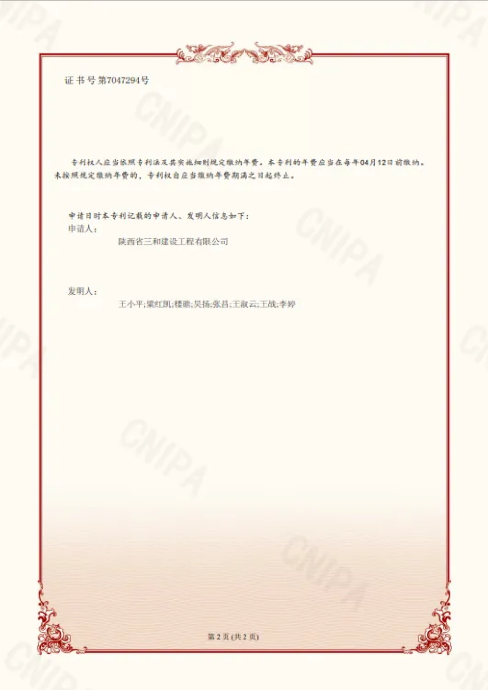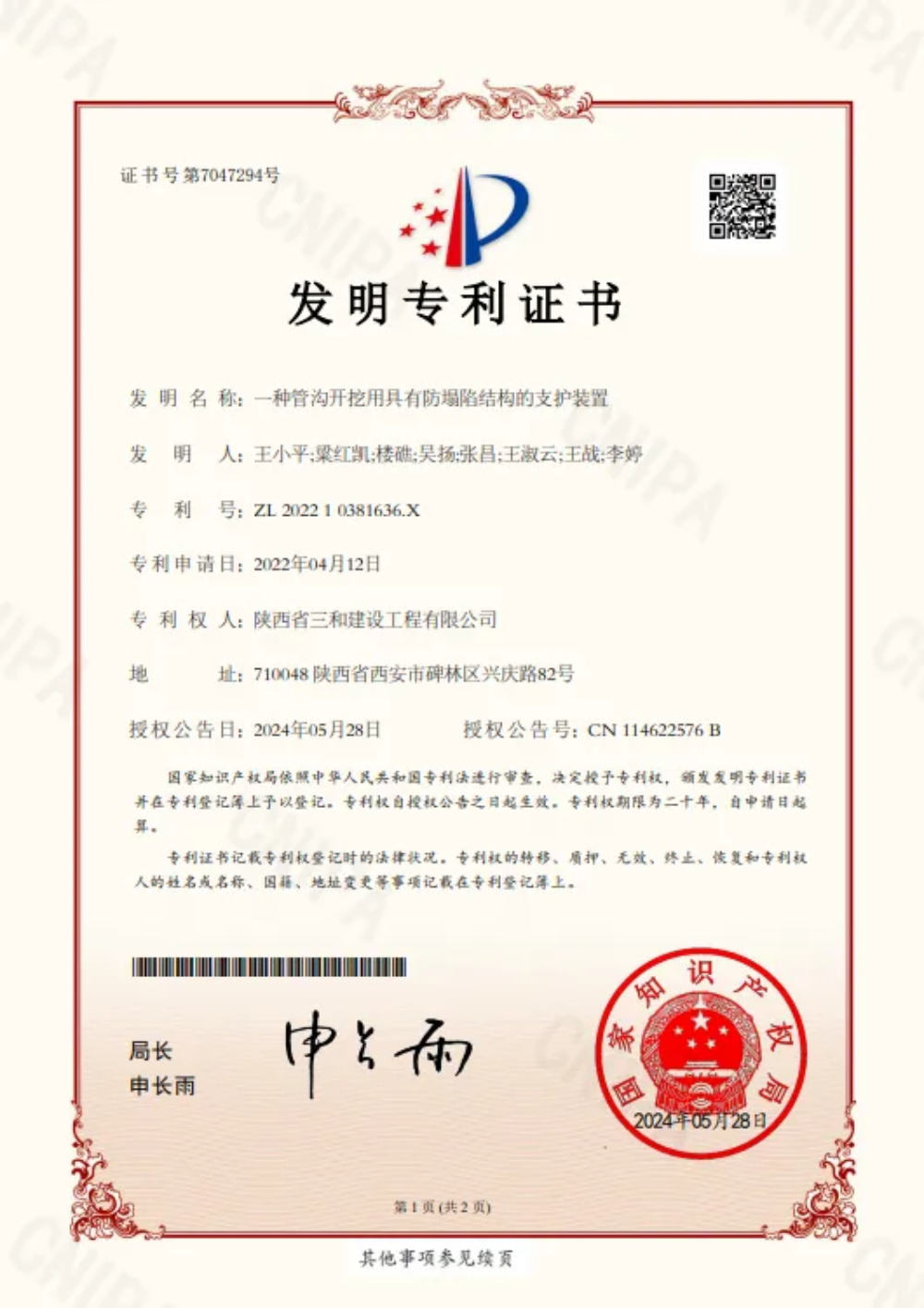 近日,陕西省三和建设工程有限公司在技术创新领域再传捷报,荣获国家知识产权局颁发的《一种管沟开挖用具有防塌陷结构的支护装置》发明专利。此项专利不仅是对三和公司技术研发实力的肯定,也是三和公司在工程安全施工领域迈出的重要一步。
